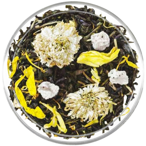 Смесь белого и зеленого чая с кусочками персика, лепестками подсолнуха, календулы, цветов миниатюрной китайской хризантемы с сочным ароматом персикамесь белого и зеленого чая с кусочками персика, лепестками подсолнуха, календулы, цветов миниатюрной китайской хризантемы с сочным ароматом персика. Богатый витаминами и микроэлементами, улучшает обмен веществ, сохраняет красоту и молодость кожи, укрепляет иммунитет, избавляет от депрессии.